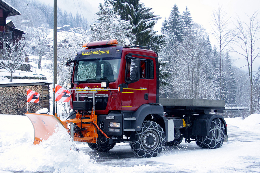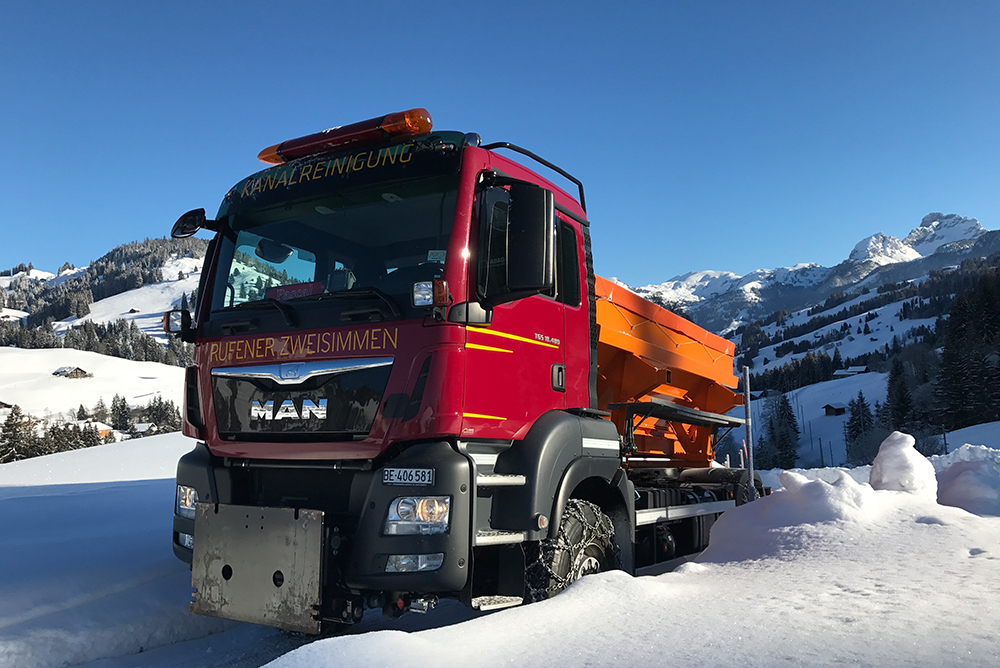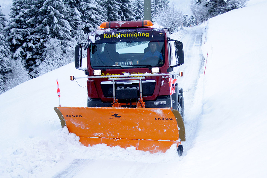 Mit unseren Winterdienstfahrzeugen entfernen wir Glätte, Eis und grosse Schneemassen. Je nach Witterungsverhältnissen setzen wir zusätzlich Salz- und Splittstreuer ein.